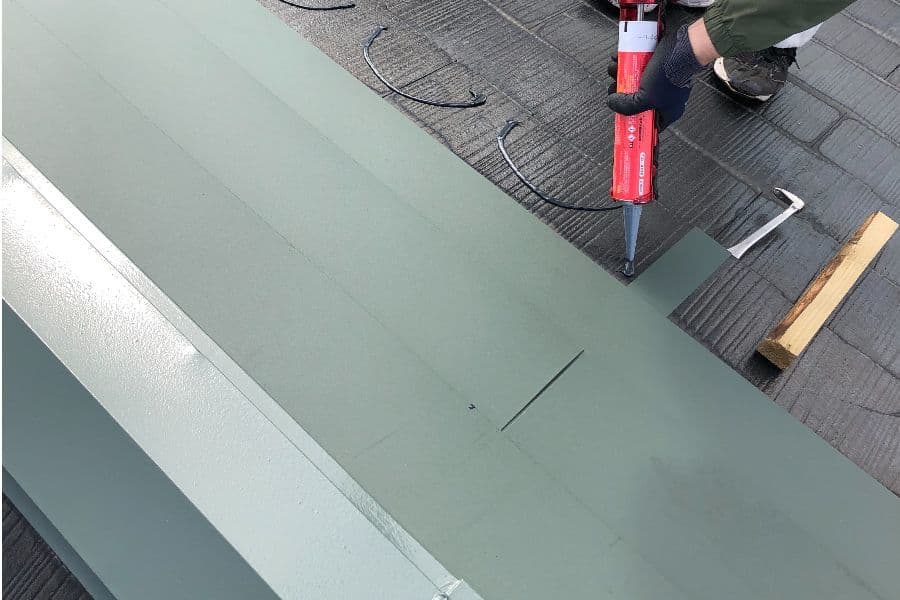 平板スレートの上下勘合は通常は密着度が高いため、ほこりや塗り替えの塗膜が上下勘合に入ると毛細管現象を起こし雨水が上下勘合を登ってしまいやすくなりますが、シーガードを差し込むことによって平板スレートの上下勘合に「小さなエアポケット」ができるため”真空”状態で発生しやすくなる毛細管現象を、解消しやすい構造に変えることができる工法です。