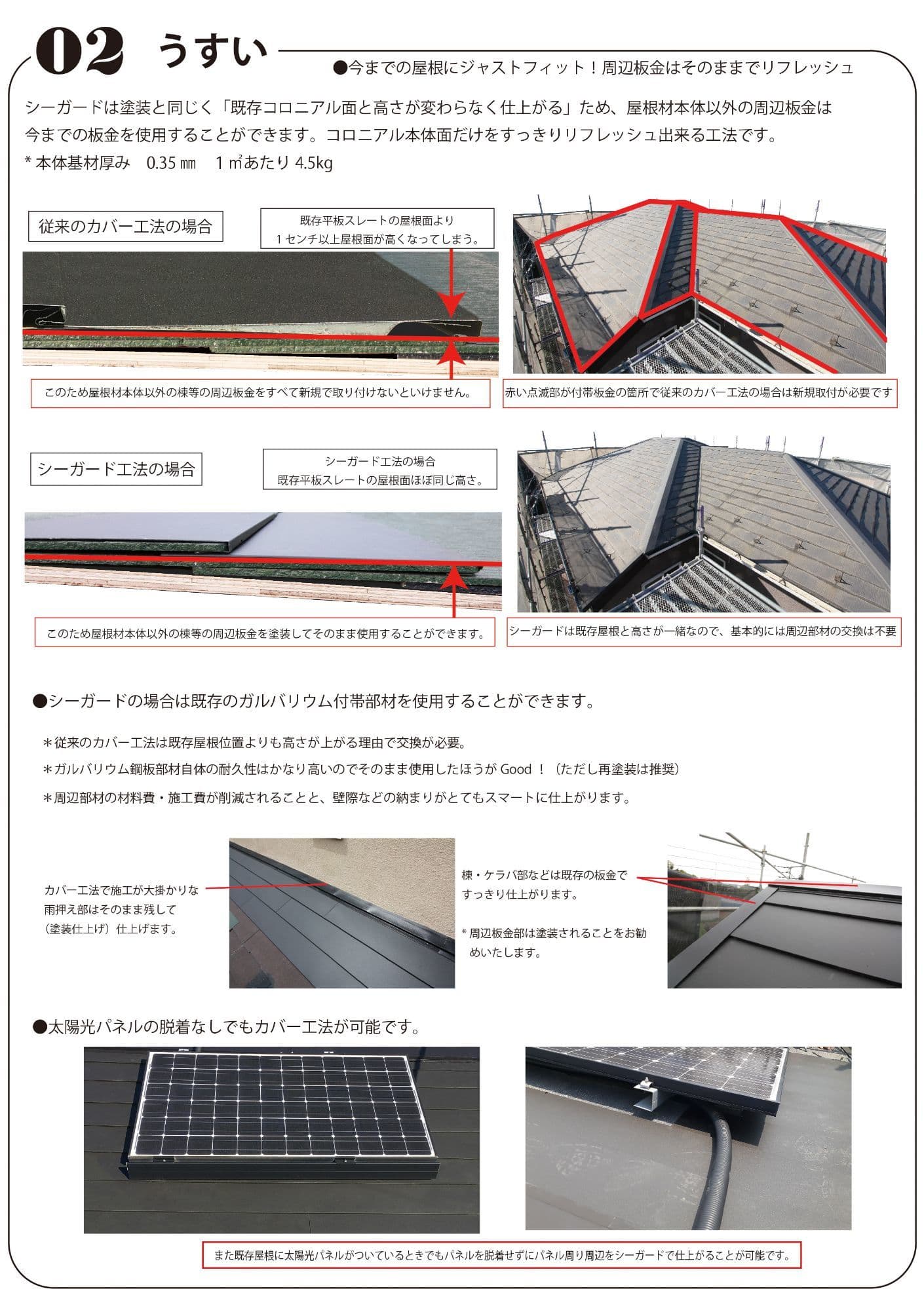 C/guard シーガードは既存平板スレートと納まりの高さが「ほぼ一緒」です。このため既存のガルバリウム鋼板の周辺板金は交換せずにそのままや塗装することで納めることができます。 従来のカバー工法の場合は既存の平板スレートよりも高さが10㎜以上高くなってしまうためにすべての周辺板金を交換する材料や工賃がかかってしまいますが、このコストおさえることができる工法です