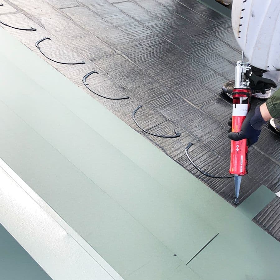 C/guard シーガードは既存平板スレートの上に専用接着剤を塗布して、その上に鋼板屋根材を張り付ける工法です。このため既存平板スレートやその下の防水層に穴を開けることなくリフレッシュすることができ、C/guard シーガードを施工したことによって漏水が発生するという心配のない「安心」の屋根リフォームをご提供しています。